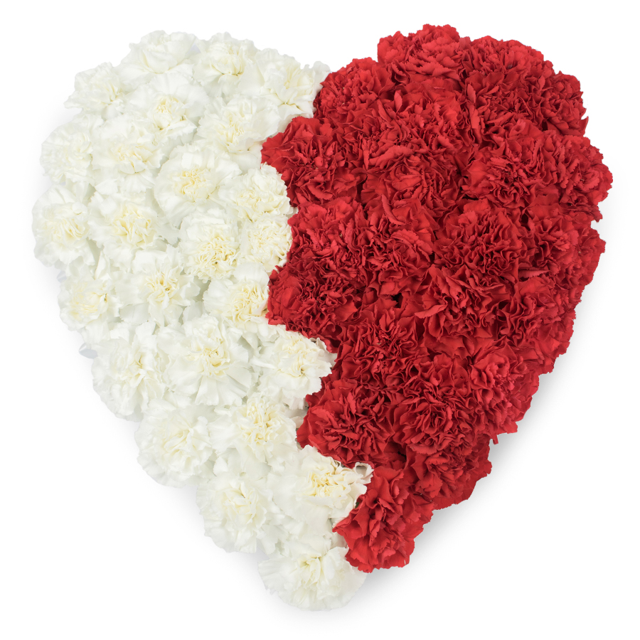 Experience the beauty and elegance of our Handy Flowers Mixed Carnations Heart Bouquet. This unique arrangement features a stunning blend of white and red carnations, symbolizing love and sympathy.