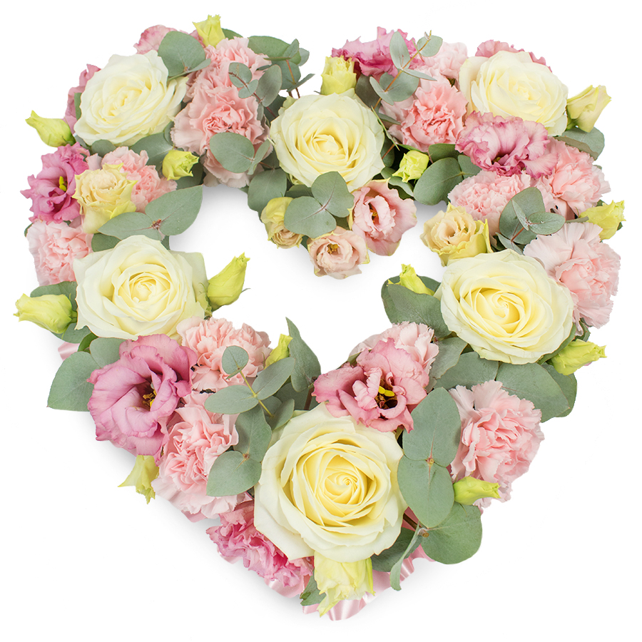 Our luxurious open heart bouquet is a perfect tribute to convey your love and appreciation. Featuring a captivating mix of whites roses, pink carnations, delicate pink lisianthus, and eucalyptus leaves, each flower is carefully selected for its exceptional quality and freshness.